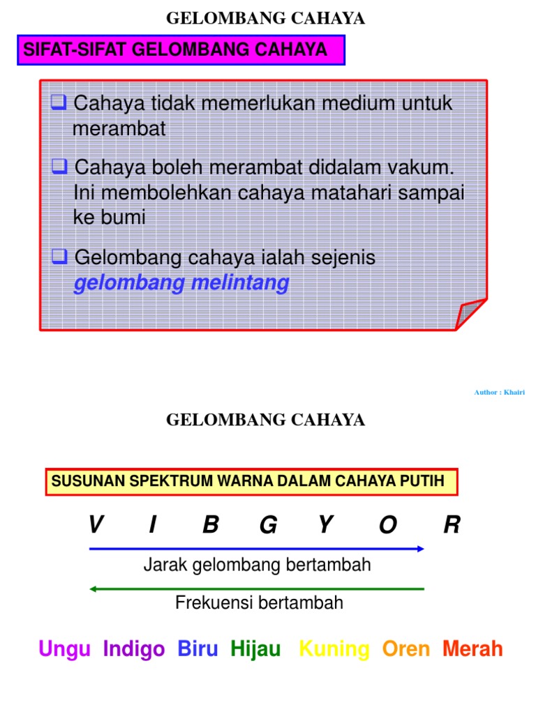 Selain itu cahaya juga tergolong sebagai gelombang tranversal karena arah getar cahaya tegak lurus dengan arah rambatnya. Seberkas cahaya polikromatik diarahkan ke prisma. Dengan menggunakan V fλ hubungan antara kecepatan panjang gelombang dan frekuensi karakteristik cahaya Merah dan Biru dapat dibandingkan.